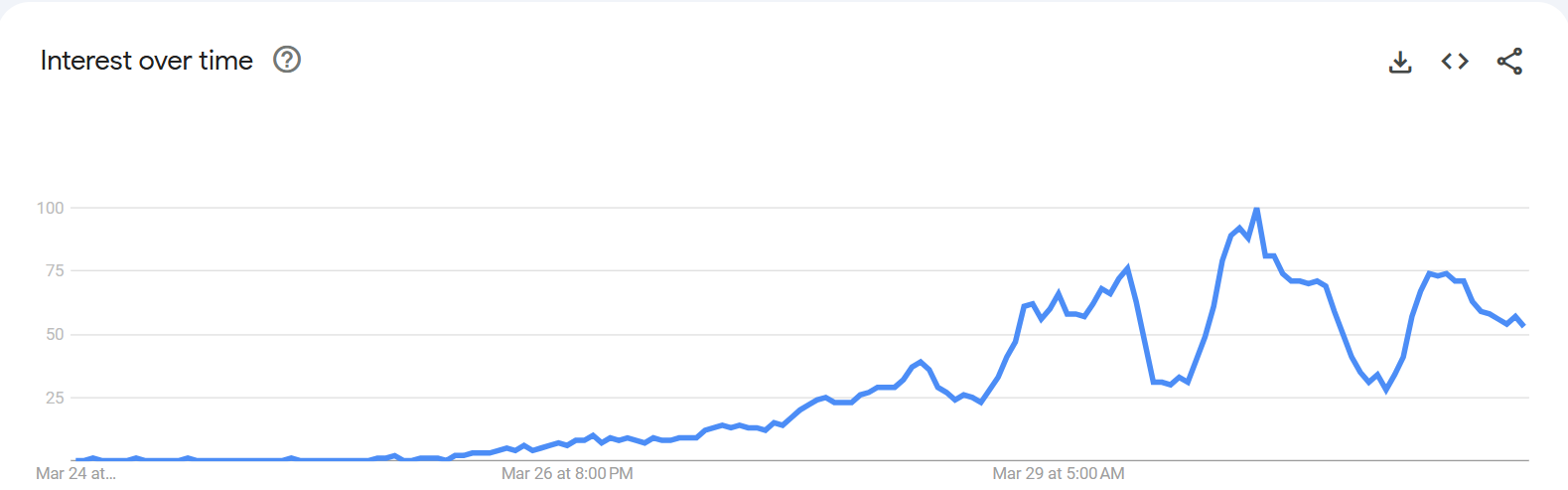 I was far from the only one: The trend dubbed “Ghiblification” quickly ravaged social media, with people transforming personal photos, memes and even historical images into visuals reminiscent of Studio Ghibli’s art style. Users also generated and shared other iconic visual aesthetics — from Disney, Pixar, Lego, The Simpsons and Dr. Seuss as well as vintage styles such as Rankin/Bass (Rudolph the Red-Nosed Reindeer) — but it was the Ghibli ones that most captured people’s imaginations as you can see from Google Trends data: