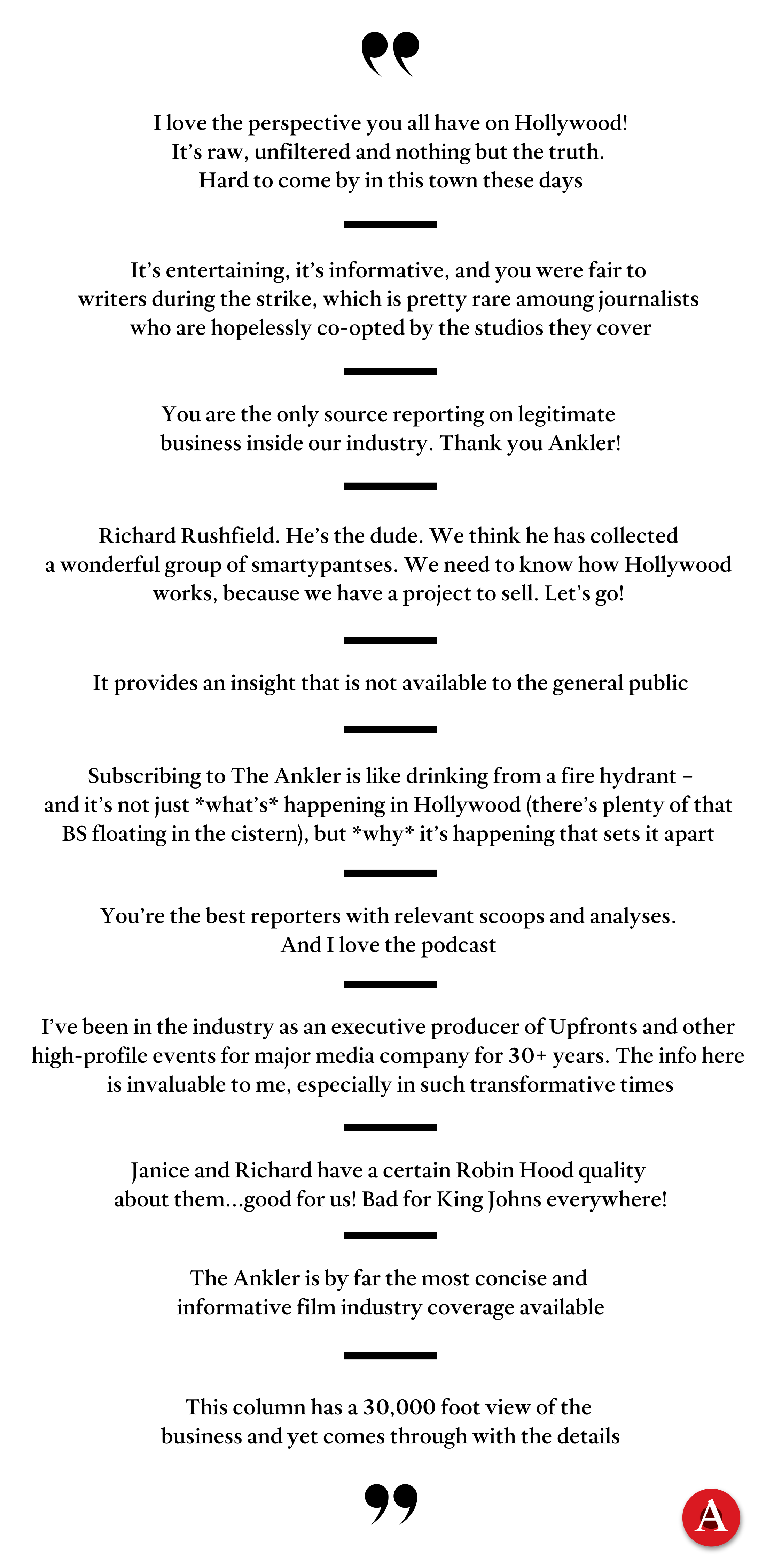 But don’t listen to us! Here are some recent testimonials left by subscribers to The Ankler when they upgraded from free to paid subscribers: