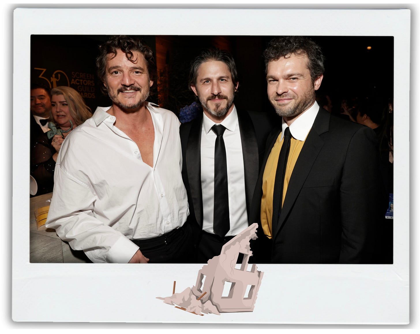 “I’m a little drunk,” said The Last of Us’ Pedro Pascal while accepting his award for male actor in a drama series (with CAA Agent Franklin Latt, center, and actor Alden Ehrenreich, right).