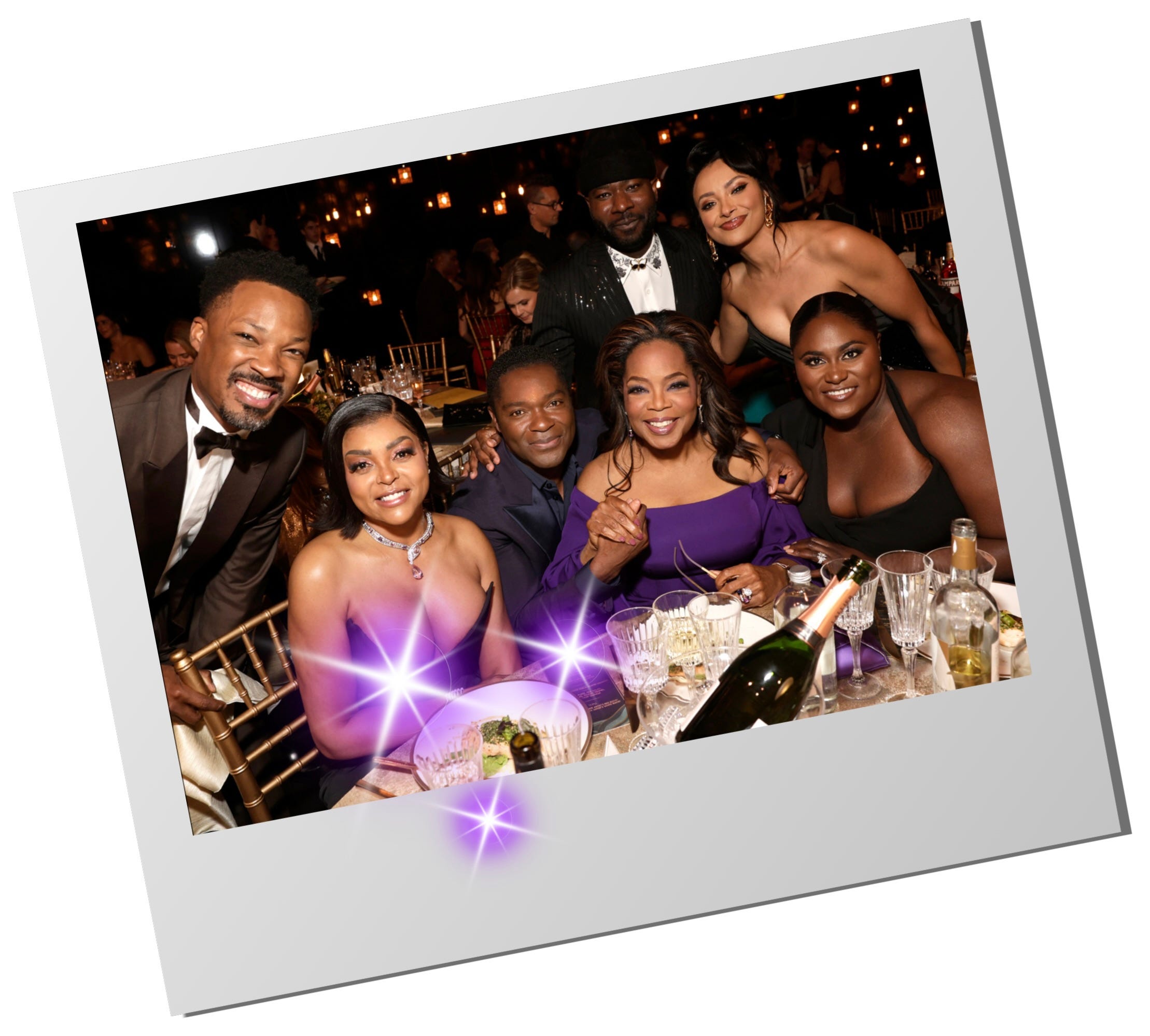 Purple reign (from left): Corey Hawkins, Taraji P. Henson, David Oyelowo Oprah Winfrey, Blitz Bazawule (above Oprah) and Kat Graham and Danielle Brooks.