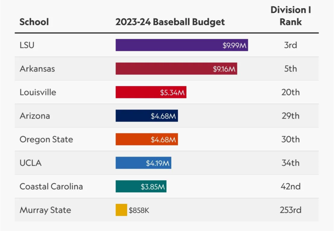 AH: Gotta love this chart about the 8 teams competing for the College World Series in the “amateur” sport of college baseball. Games begin today on ESPN.