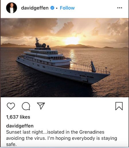 Well, the wolves are sneering at the door now. David Geffen may not have anything to lose at this point, but for anyone who isn't planning to spend the rest of their life at sea, this little valentine should represent the point when the public stopped being amused. At all.