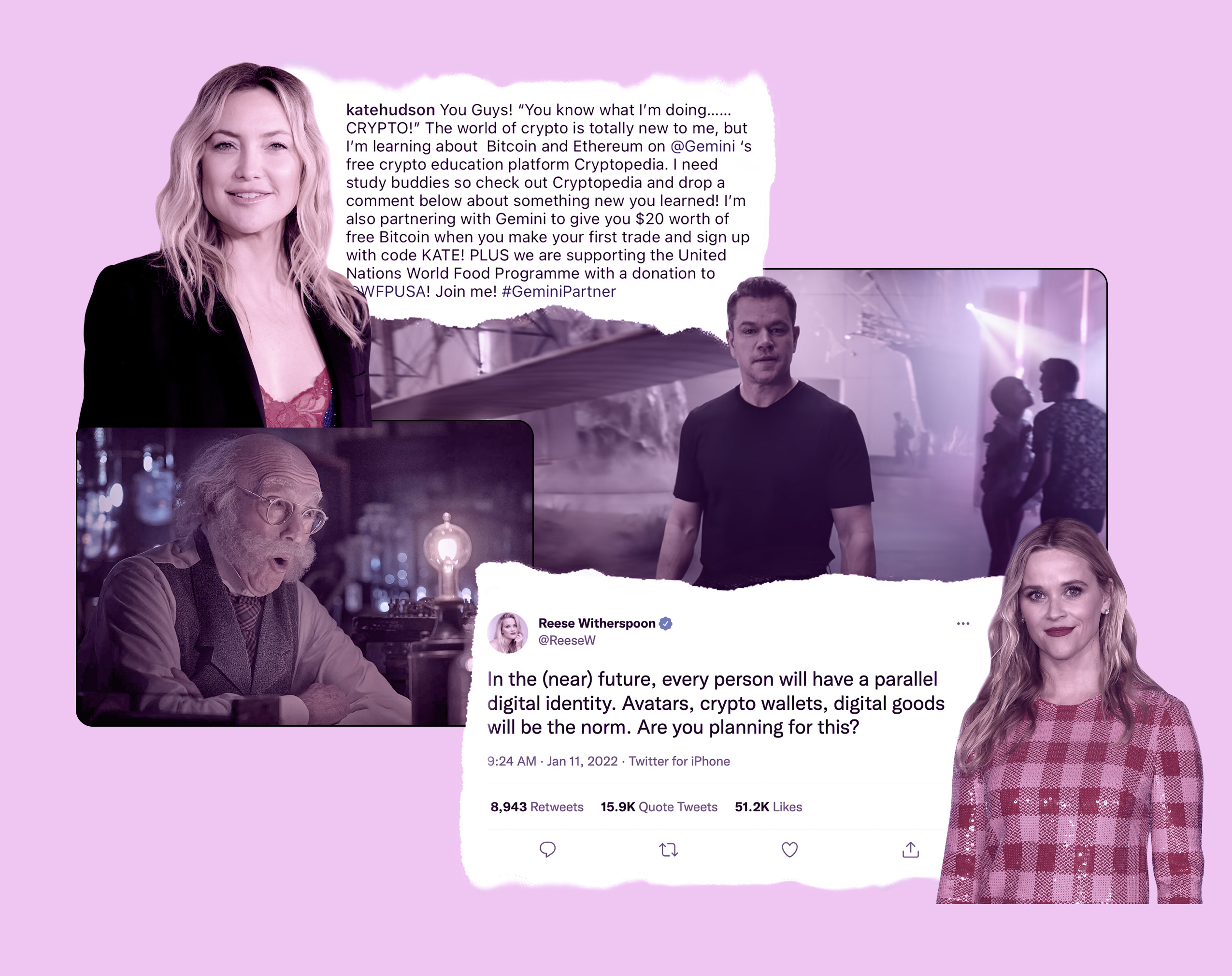 TALES FROM THE CRYPTO Clockwise from top left, Kate Hudson, Matt Damon, Reese Witherspoon and Larry David are part of the wave of celebrities who promoted crypto. (Illustration by Haley Kluge; Hudson: Rich Fury/Getty Images; Damon: Crypto.com; Witherspoon: Valerie Macon/AFP via Getty Image; David: FTX + dentsuMB)