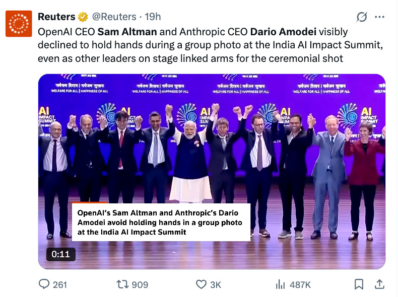 Ya gotta love absolutely bitter AI rivals Sam Altman and Dario Amodei (the 2 guys to the right of India Prime Minister Narendra Modi below) refusing to grab hands together at an India AI summit this week . . . as every other person did on stage.