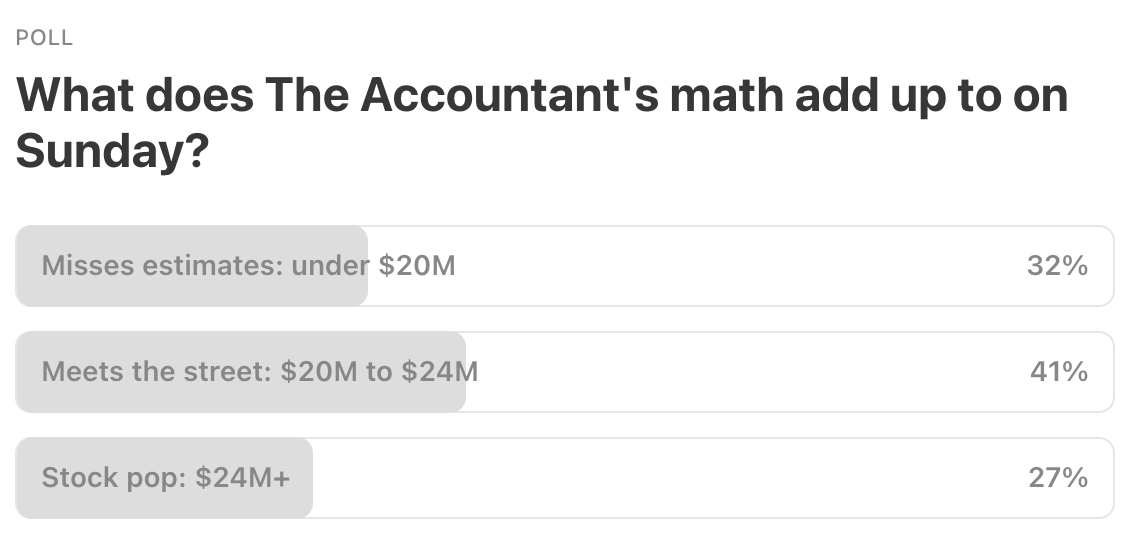 I’ll go with the crowd on this one, think Accountant will cross $20M, but that competition out there is tough this weekend for any overperformance.