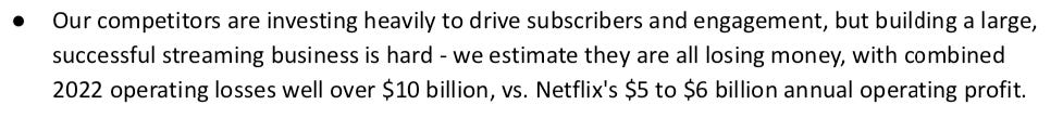 These themes both set the terms of debate for Netflix and streaming at large. And that’s a brilliant strategy if you can pull it off. For years, Netflix focused Wall Street on its subscriber growth (while losing lots of money), and by the end of the 2010s, convinced all of traditional media to chase subscriber growth, too (while also losing lots of money!). But as soon as sub growth stalled, it pivoted to a new argument for media dominance: