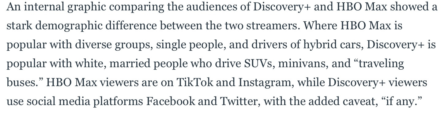 The Daily Beast reported that laid-off Warners executives are foreseeing “a rejection of left-wing or highly diverse content in favor of more homogenous, Middle America-friendly fare.” Interesting detail from the piece: