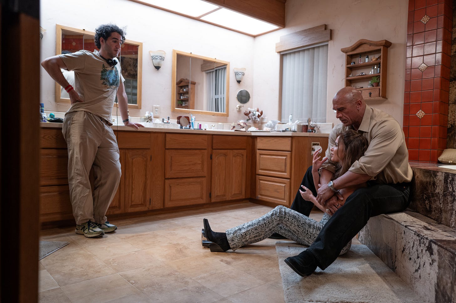 At one point in our conversation, she stepped out of the Zoom frame to grab another memento, a framed photo of an image I’d already seen from the set of her emotional drama The Smashing Machine. The picture shows Blunt and Dwayne Johnson huddled together on the floor of a ’90s-style bathroom, with director Benny Safdie leaning on the counter just a few feet away. It was taken just after they’d filmed the extensive argument, scored by Bruce Springsteen’s “Jungleland,” that serves as the film’s emotional climax. Blunt’s character, Dawn Staples, both devoted to and exasperated by her MMA fighter partner, Mark Kerr (played by Johnson), picks a fight that explodes beyond control: A gun is pulled, and the cops are called and the characters reach an emotional breaking point. In a movie that everyone who made it describes as surprisingly powerful, it’s the scene where it all gets laid bare.