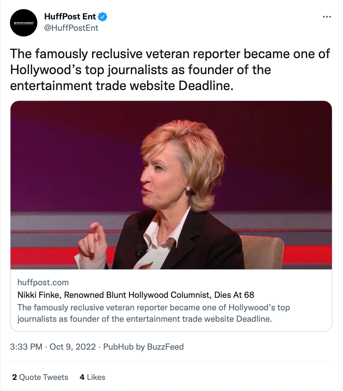 And this tweet from Huffington Post, with the accompanying picture, mistaking the very much alive and vibrant Tina Brown for Nikki Finke — says it all. Out of sight, out of mind.