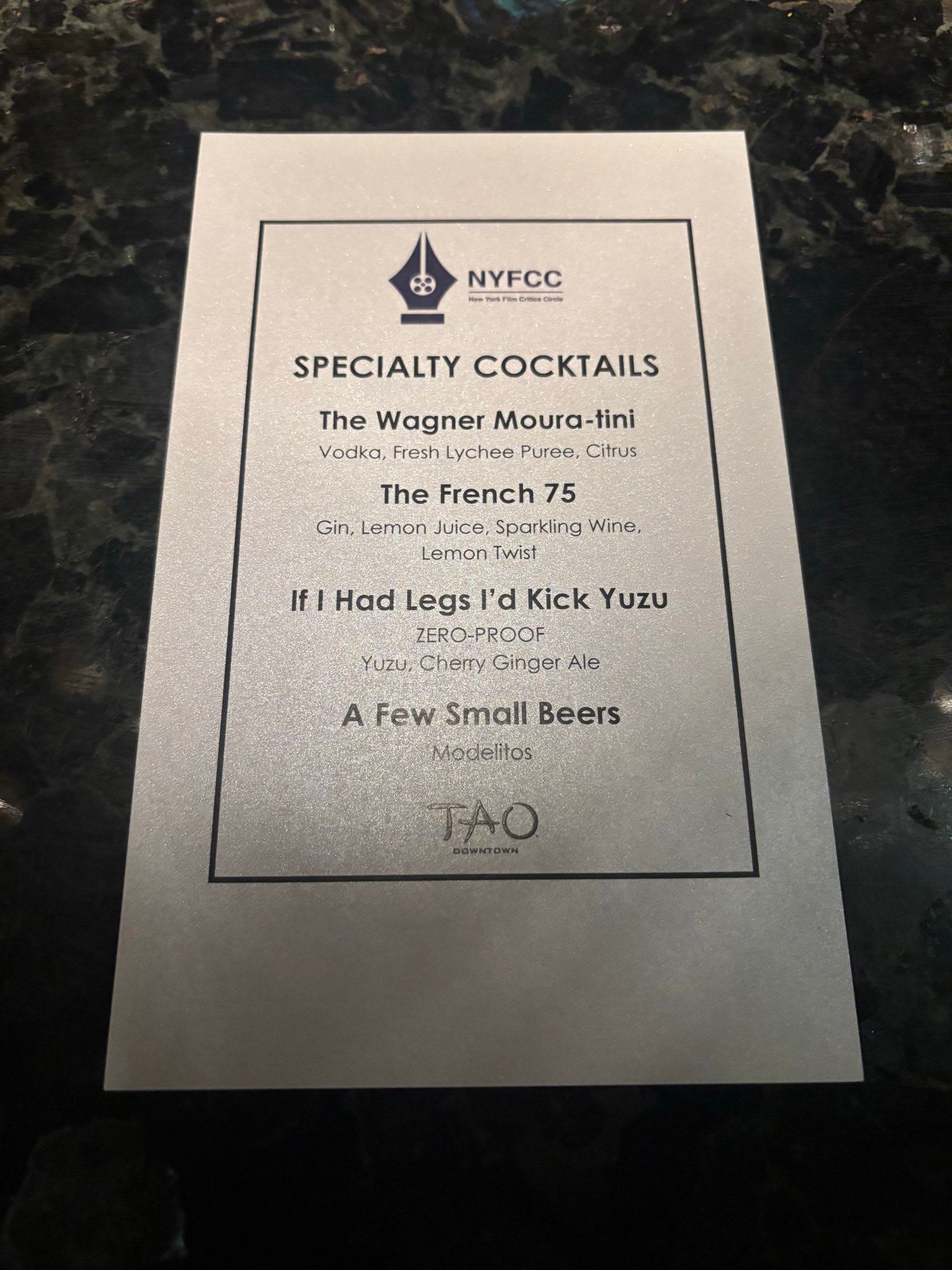 You know where you can find nothing but momentum and good cheer in awards season, though? An awards dinner where all the winners are announced in advance, the cocktails have clever names that reference the year’s biggest movies (see above) and the dessert plate is generous. Ahead, my night at the New York Film Critics Circle Awards on Tuesday, including a major star’s surprise dip in a koi pond and a few bits of Oscar buzz, too.