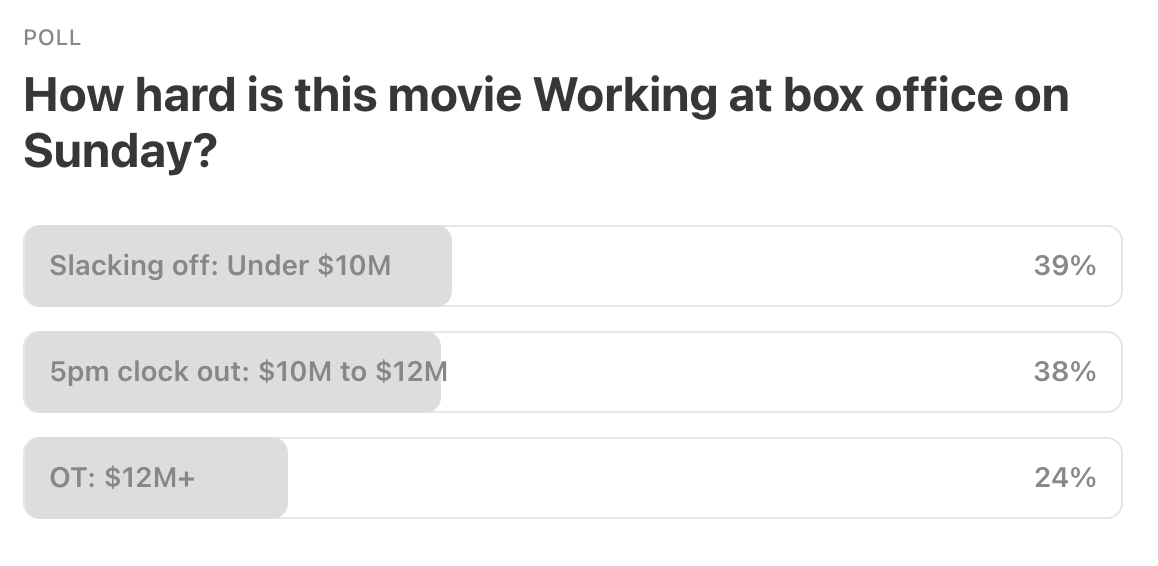 Seems like most folks think A Working Man won’t be working too hard this weekend, now the final full movie campaign to come out in the Salke era. I’ll leave the “working” jokes there to y’all and go with the $10M to $12M crowd.