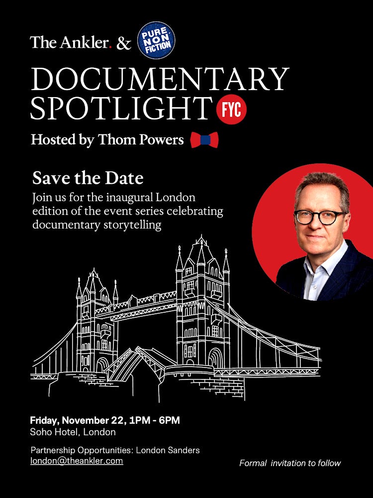 Ankler EventsSave the Date: The Ankler x Pure Nonfiction Documentary Spotlight Series Heads to London 11.22Oct 25, 202418SharePreviousNext