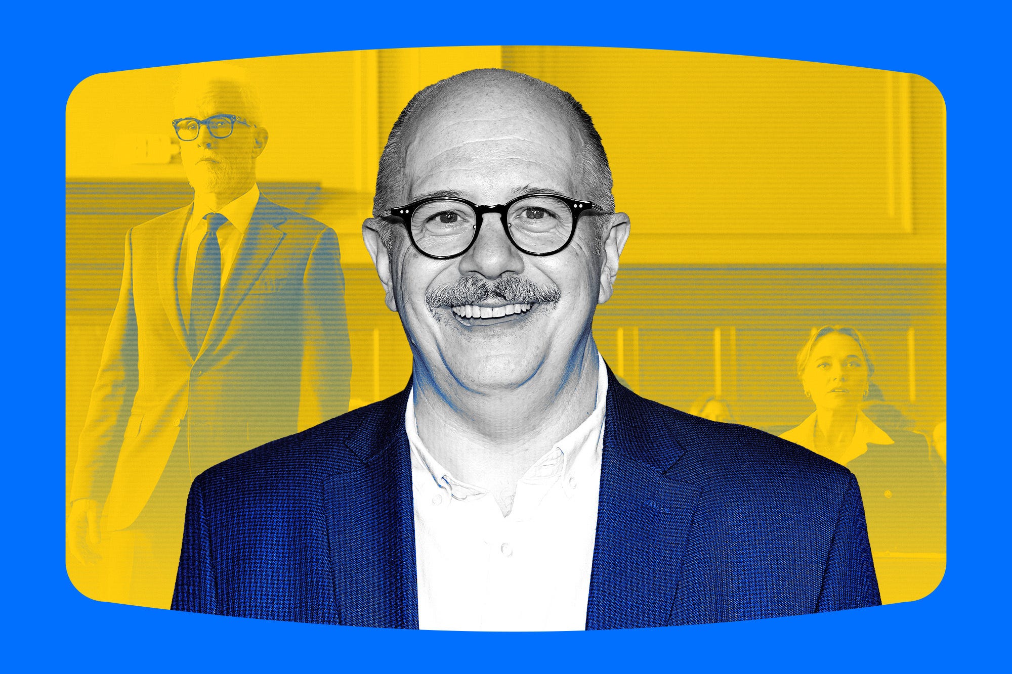 USA’S NEW DAY “We’re making the rules,” Michael Sluchan tells me. “We want to work with producers to figure out what deal structure looks best for everyone.” (The Ankler illustration; Sluchan: Adela Loconte/Variety via Getty Images; Rainmaker: Christopher Barr/USA Network)