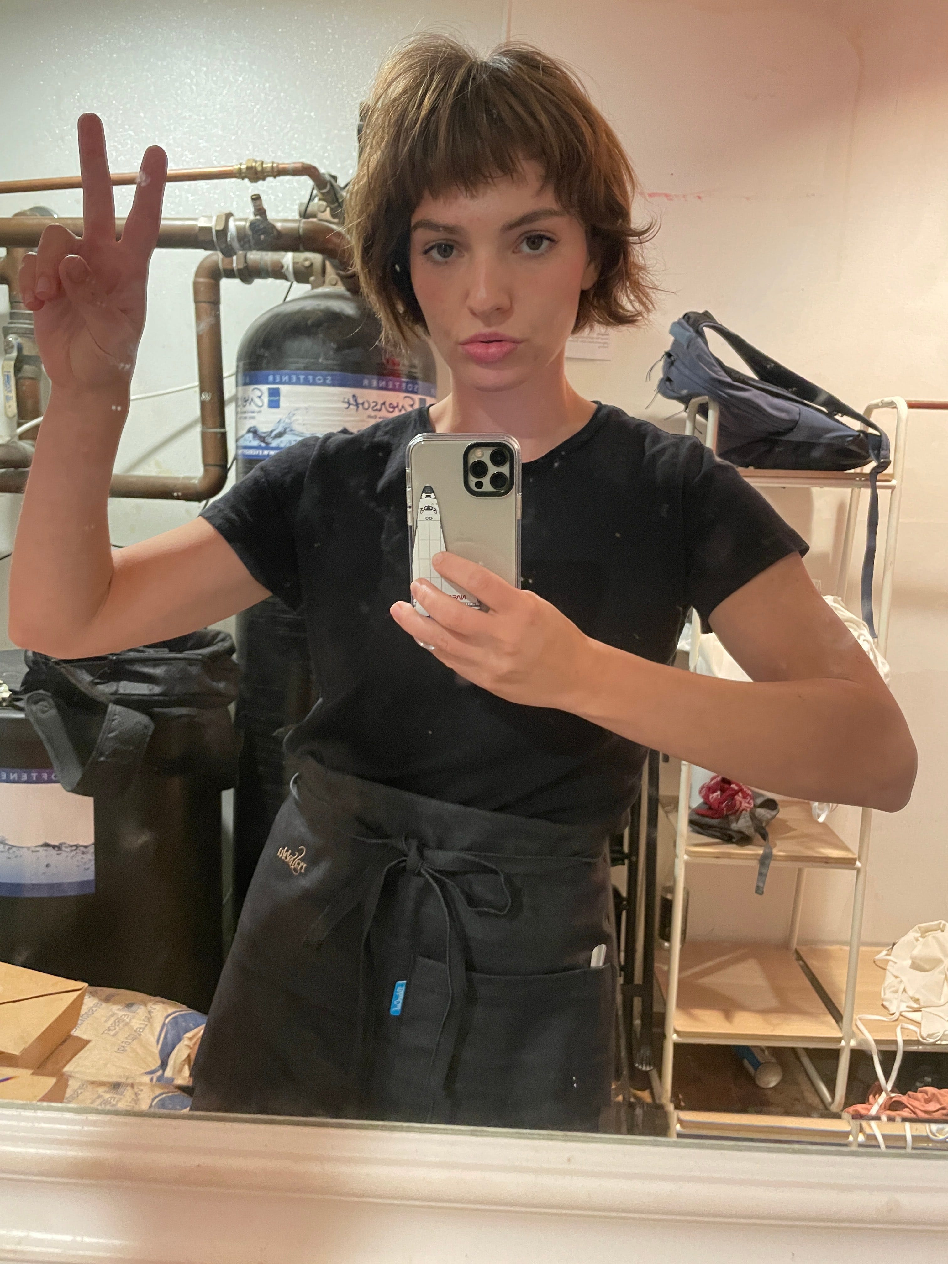 NEW GIG Actress Addie Weyrich snapped a selfie from the locker room at her new gig working in a restaurant. But it’s better than the alternative: “Otherwise you feel so alone.”