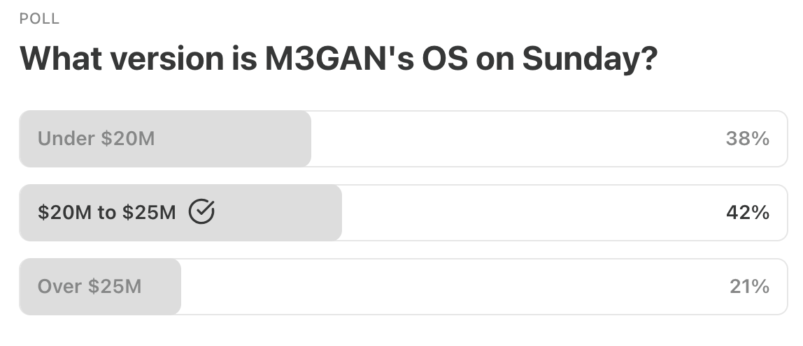 M3GAN 2.0 — I think this one will cross $20M, so count me in with the populists here.