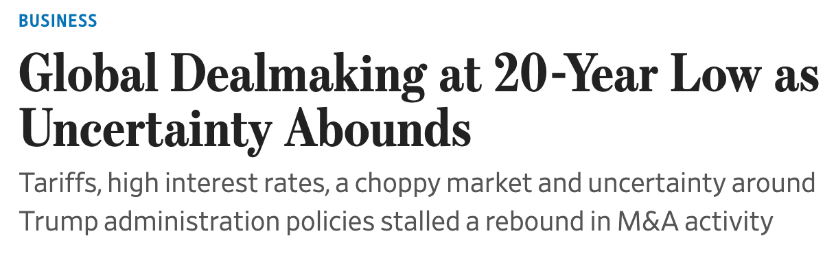 ALSO: Just a reminder that “No one knows anything” doesn’t just pertain to Hollywood — for all of the Wall Street “expert” bluster at the end of last year about the era of dealmaking that the Trump 2.0 era would usher in: