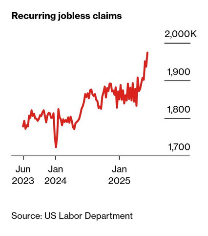 YEAH: This new unemployment data also isn’t great. How’s that job hiring market, eh? Granted, Elon’s Q1 DOGE cuts probably didn’t help this . . . but going back further than this chart — this 👇 is now at the highest number since Nov. 2021.