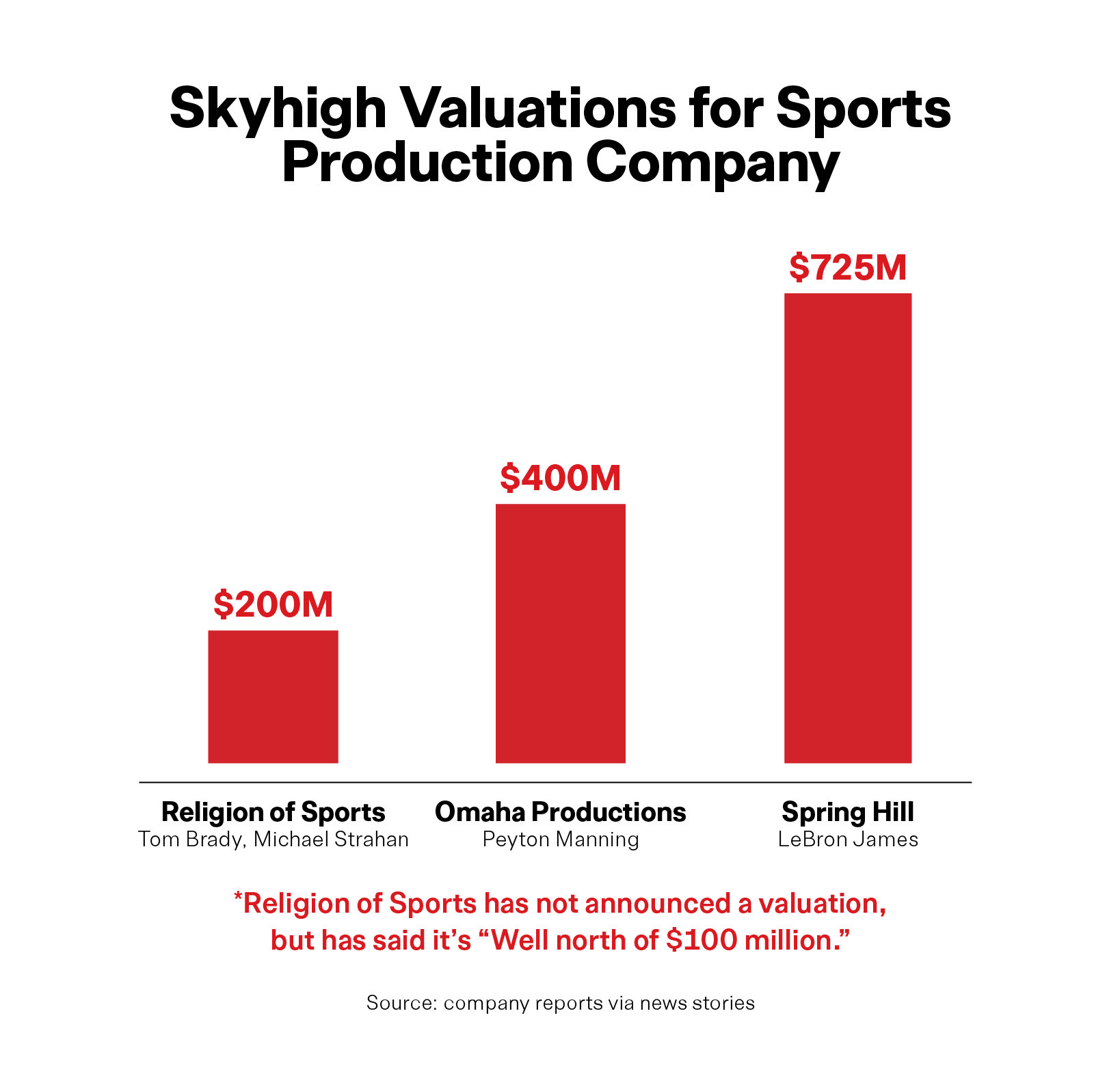 Peyton Manning’s production company, Omaha Productions, is worth $400 million, based on its latest fundraising round. LeBron James’ SpringHill is worth $725 million based on the same. They must have a lot of hit shows, right? Right??
