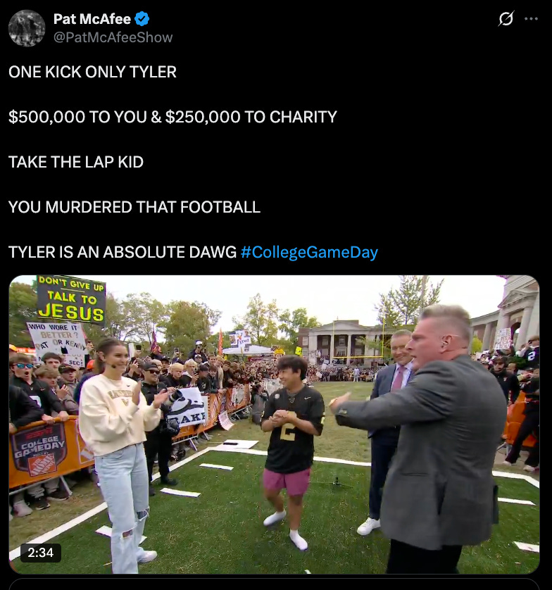 BUT: There’s always kicking field goals! This kid really drilled this thing yesterday . . . well done! Musta been the Jesus signs. Enjoy the half-mil.