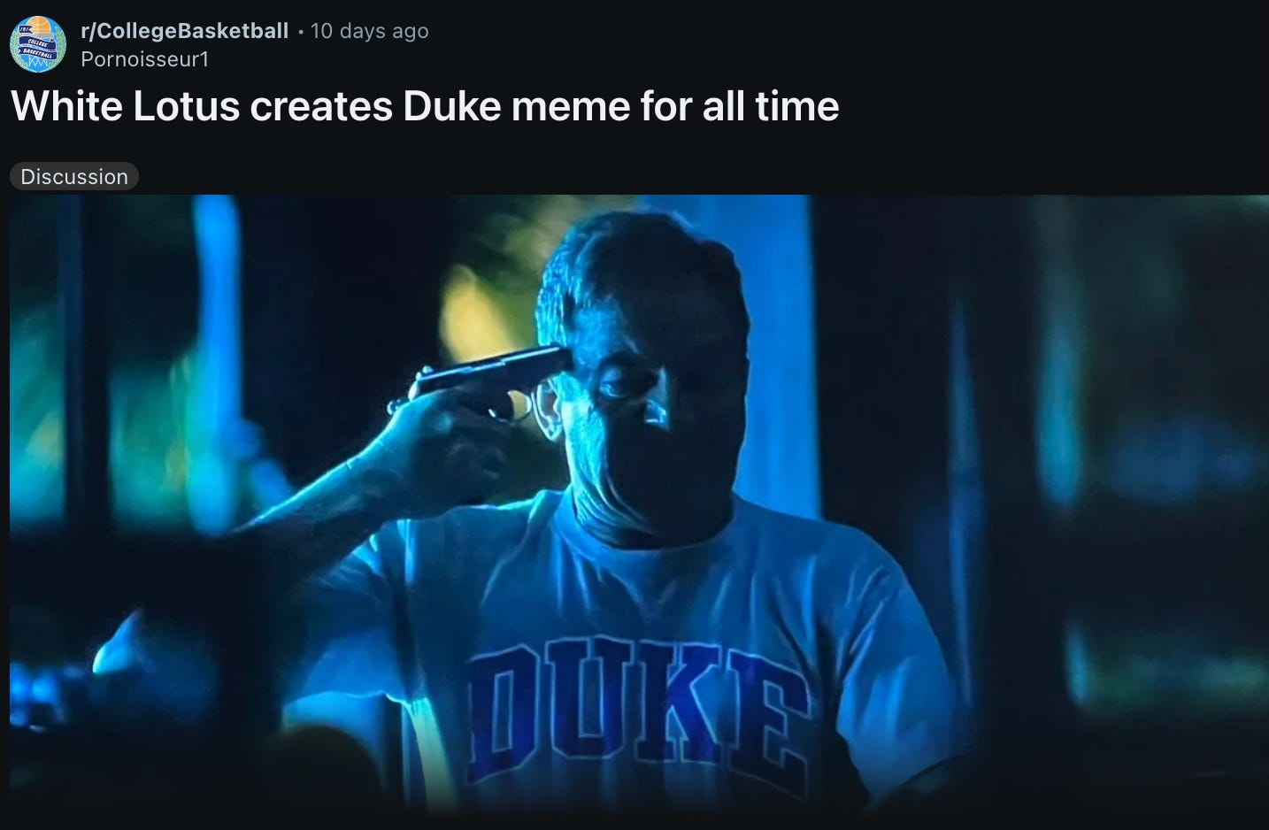 As a proud neighbor of Duke University, I hereby volunteer to drive over and teach its administrators about the Streisand Effect, which is almost certainly what will happen now that the university’s VP for communications has told Bloomberg how HBO’s The White Lotus “simply goes too far” in its use of Duke’s logo. True, the image of Jason Isaacs’ troubled businessman character holding a gun to his head while wearing a Duke T-shirt is probably not what the esteemed uni would want in an ideal world, but it will undeniably goose merch sales to UNC students eager to recreate a meme come Halloween.