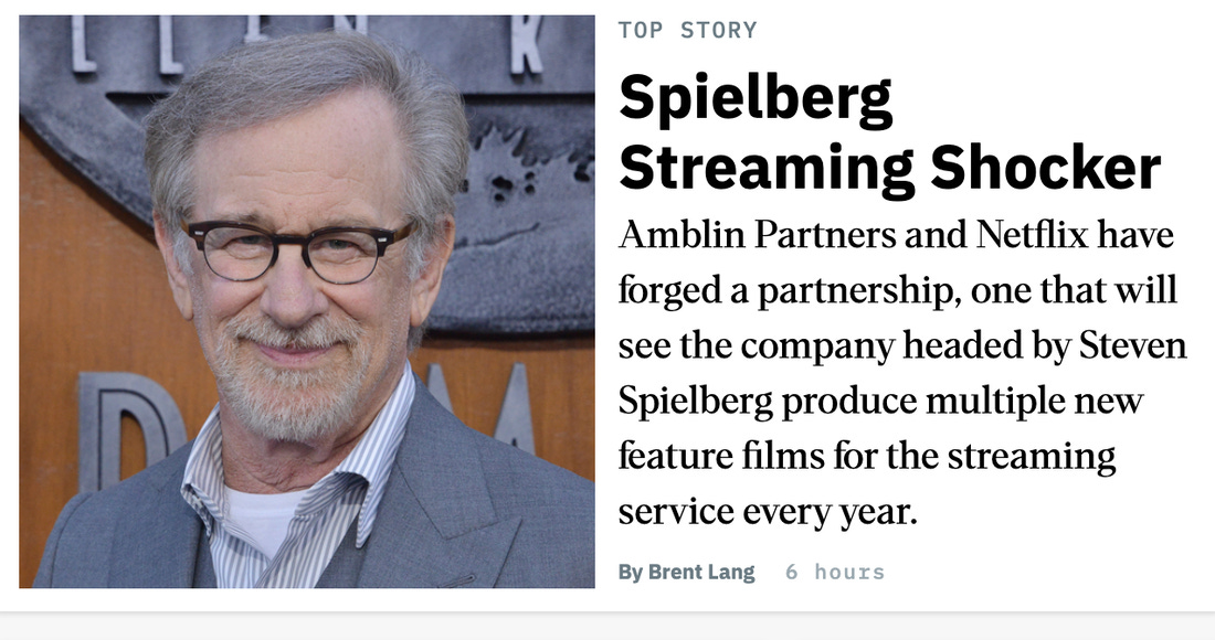 41. Steven Spielberg does an about-face on his Netflix jihad, announcing his company will make things for The Service. The announcement is received with great fanfare, including this headline below, even though he doesn't say he himself be making things...and the history of Amblin in TV productions is, shall we say, mixed.