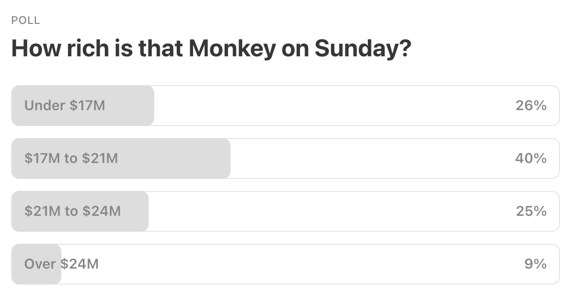 No money being exchanged here with The Monkey (Matthew and I need to start working on this), but here’s what y’all think. I’ll go with the majority 40% here.