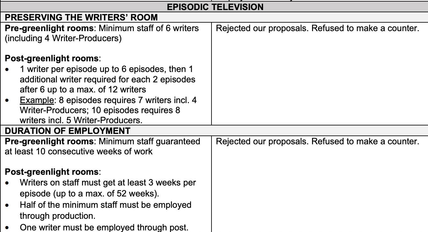 Essentially - the AMPTP is going with the tactic of saying the WGA is trying to set quotas, with no exceptions. And everyone hates quotas… much less in a business of creativity - so let’s lean into that.