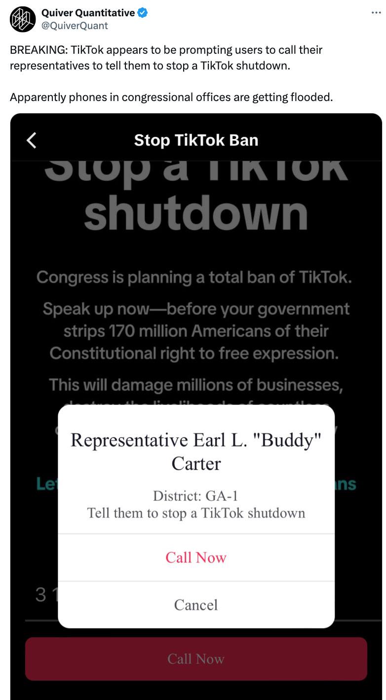 Yeah, maybe next time TIKTOK — don’t send notifications to American users that allowed them to call their House representatives with a few taps on the app (many of whom I’m sure aren’t even of legal voting age), leading to some elected officials being “bombarded with hang-ups and questions,” according to the WSJ, and some shutting down their phones to all constituents as a result (some of whom, perish the thought, may have had non-TIKTOK issues). And ya say the vote was 50-0 in favor, huh? 🙄
