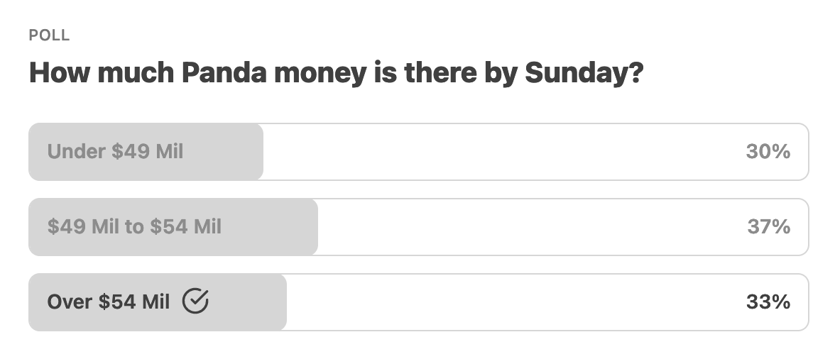 I’m joining the Kung Fu Panda 4 optimists this weekend at “Over $54 Million”