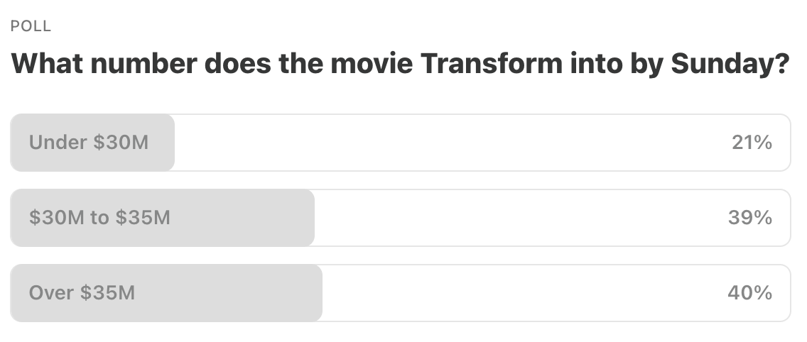 Count me in with the 40% optimists this weekend on Transformers One, think the word of mouth will give this a boost . . . plus let’s keep this box office magic going.