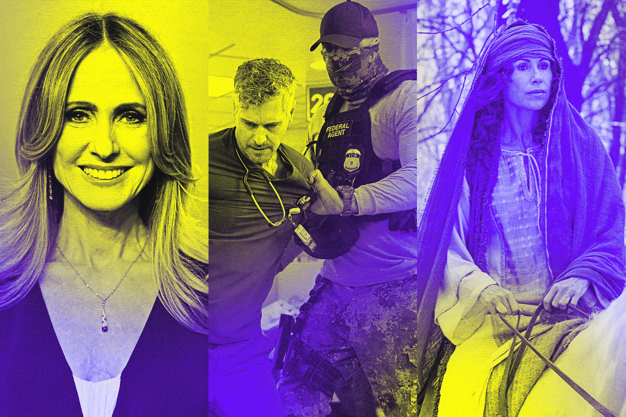 POWER AND FAITH From left: Disney’s Dana Walden, ICE action on The Pitt and Fox’s The Faithful. (The Ankler illustration; Lionel Hahn/Getty Images; HBO Max; Fox)
