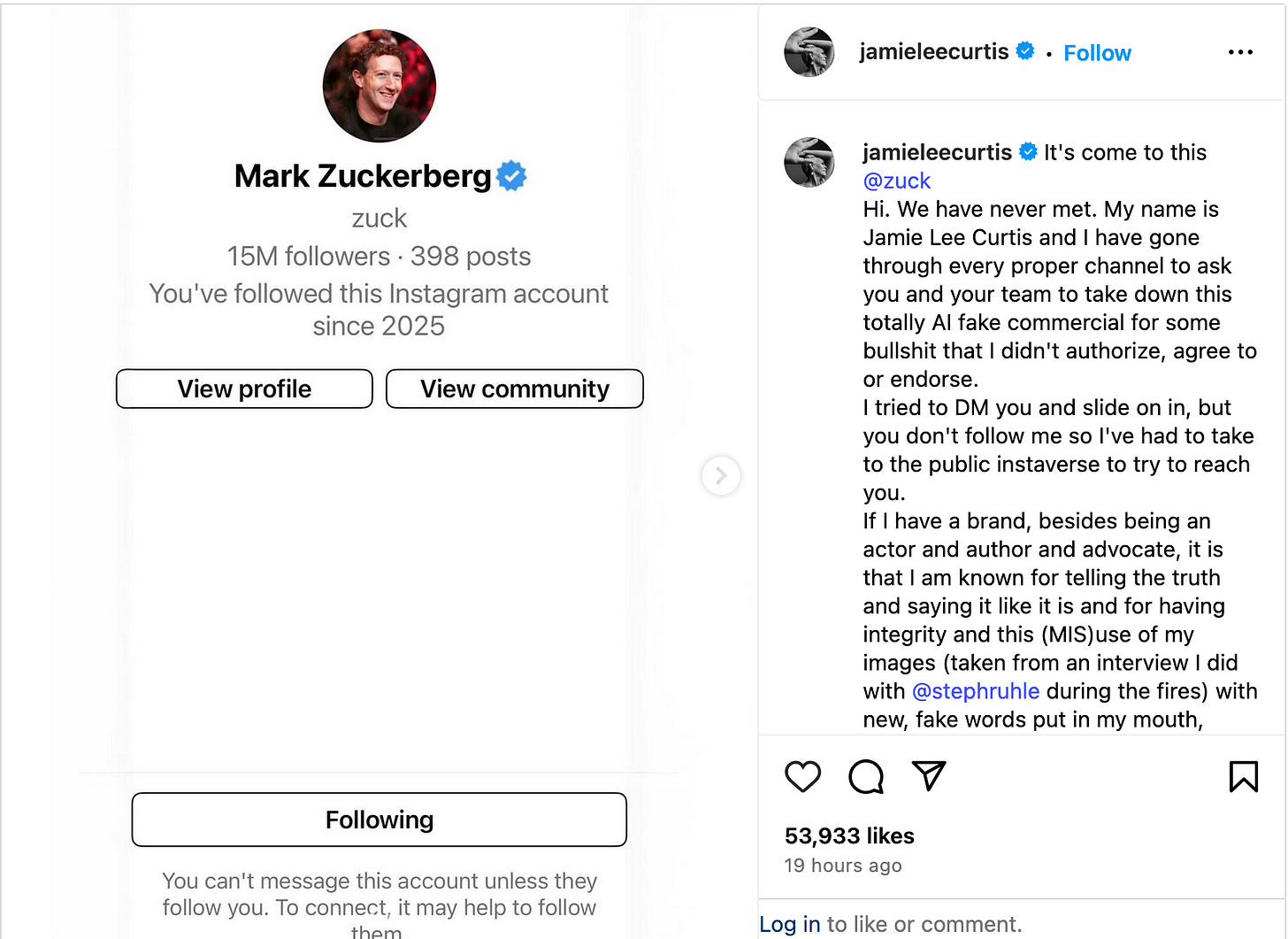 AH: Everyone’s favorite new Upfronts talent Jamie Lee Curtis got creative in trying to find a way to get META to pull down a fake AI ad on its platforms featuring the actress, as the existing “methods” of doing so were doing . . . nothing. 😱 META took down the ad a couple of hours later.