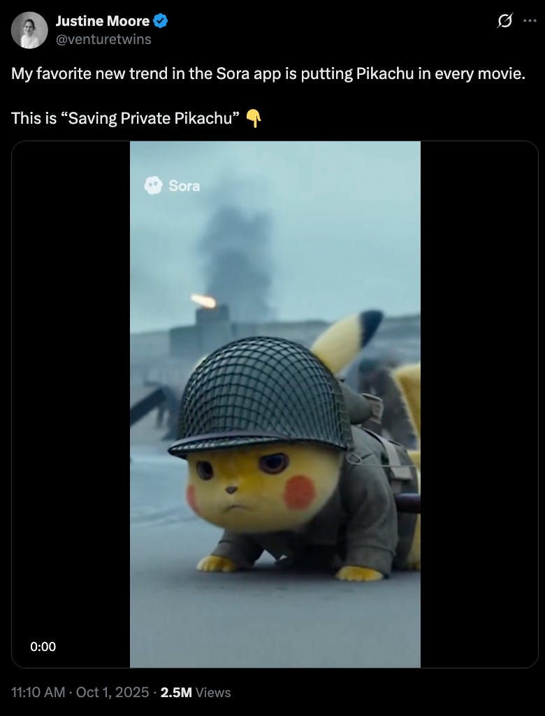 YAH: Now that new SORA has been out in the wild from OPENAI for a few days, it’s totally outputting videos with copyrighted characters like Super Mario, Family Guy and South Park characters, Lara Croft, SpongeBob and, of course . . . Pikachu from Pokémon directly being featured in several movies (there are more clips in the X post).