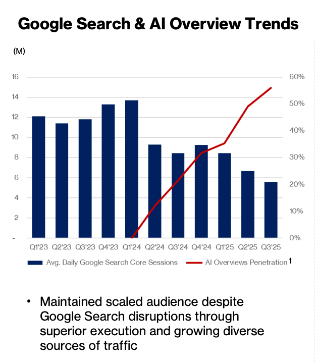 AH: Those folks at PEOPLE INC. gave us our latest handy snapshot of the effect of AI on GOOGLE traffic via IAC’s Q3 earnings report.