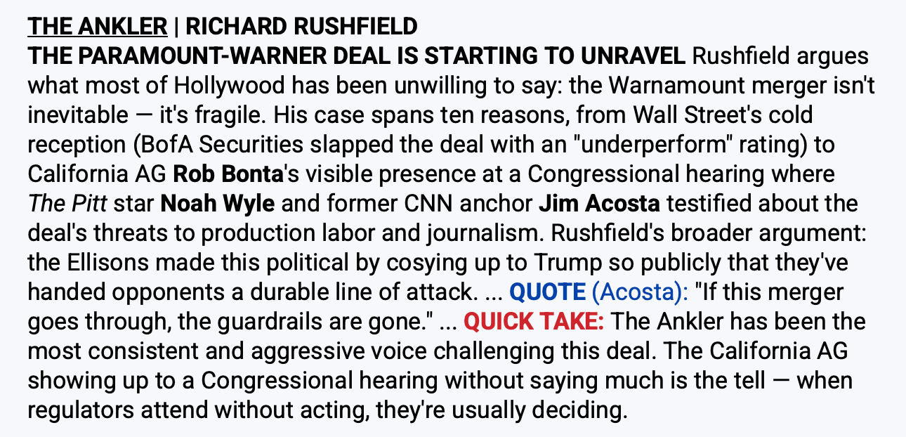 Mediaite took note of this fact this past week, highlighting Richard Rushfield’s leading coverage of the Paramount-WBD merger in a moment where most other media mindlessly accepts it as a done deal — even cheerleading it — no questions asked.