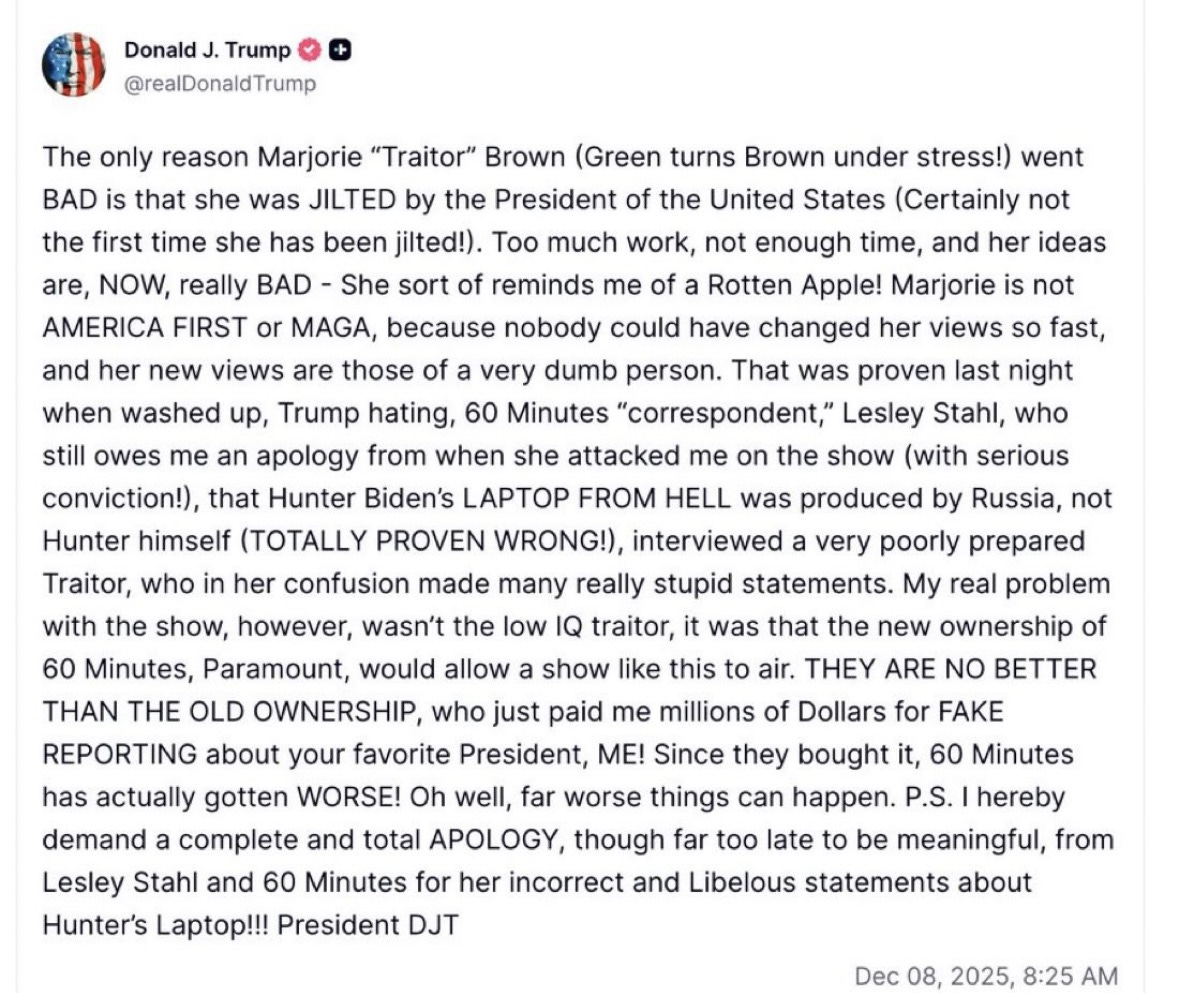 Even worse, having rigged the contest fair and square, it appears that their mark refuses to stay bought, and King Donald is having an orange tantrum at them about last night’s 60 Minutes interview with Marjorie Taylor Greene: