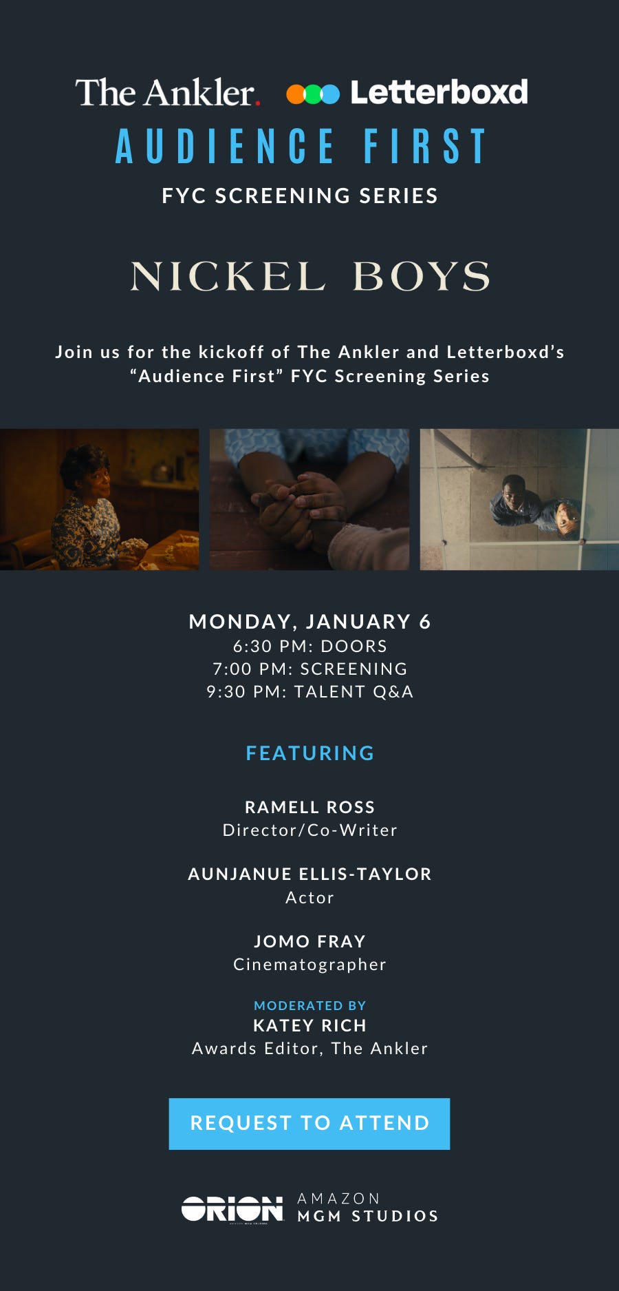 Ankler Media and Letterboxd, the go-to global hub for film discovery and discussion, announced today a co-branded screening series, with Q&As, that kicks off Jan. 6 ahead of the 97th Academy Awards. Titled The Ankler x Letterboxd Presents: Audience First, The FYC Screening Series launches with a special screening of Nickel Boys and a Q&A with the film’s director RaMell Ross, actress Aunjanue Ellis-Taylor and cinematographer Jomo Fray, moderated by awards editor Katey Rich of The Ankler’s Prestige Junkie. Please click HERE to request an invitation.