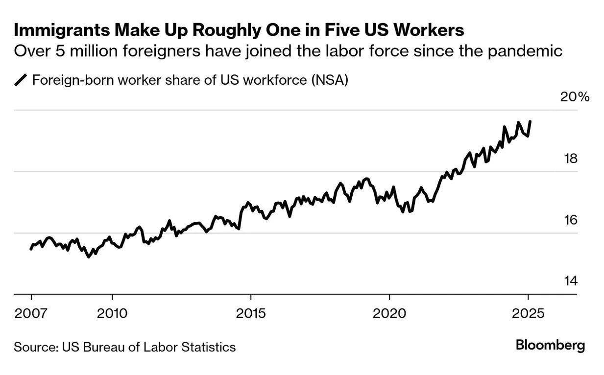 FINALLY: This chart on immigration as part of the workforce is pretty startling. A near 25% increase in the overall workforce percentage in the last decade.