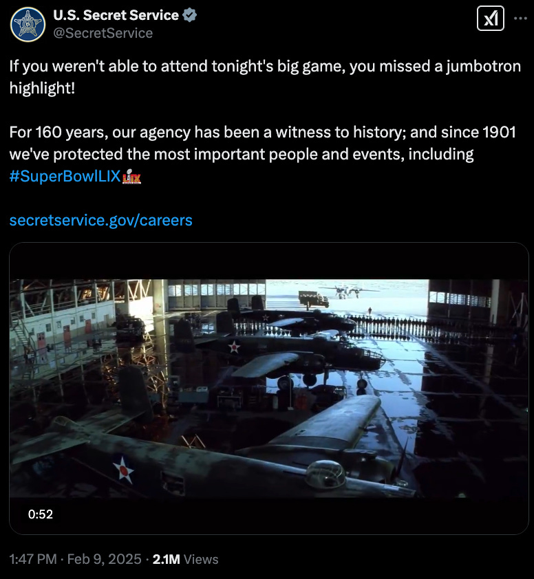 BUT: I’m still waiting for word that Elon and his crack team are gonna put a stop to writing $2M checks to Michael Bay for producing 1-min Secret Service recruitment spots (that seemingly about half-consist of stock footage) which played inside the Superdome on Sunday. Or a $50k paint job for PENTAGON honcho Pete Hegseth’s new gov’t-supplied house, but I digress.